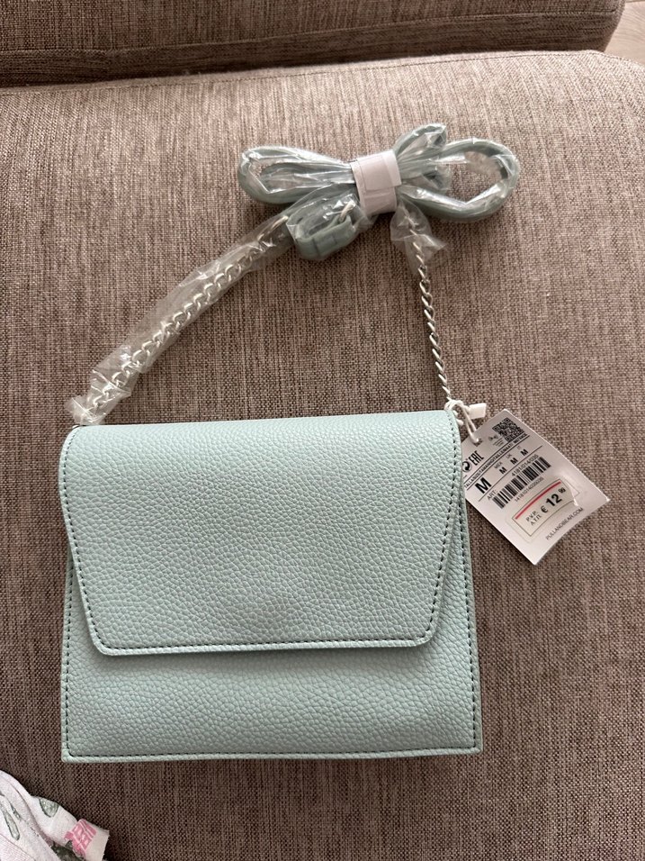 Pull an Bear markası Turkuaz renkte, zincir detaylı deri kadın çantası. Minimalist tarzda, baskılı deseniyle günlük sokak stiline uygun.