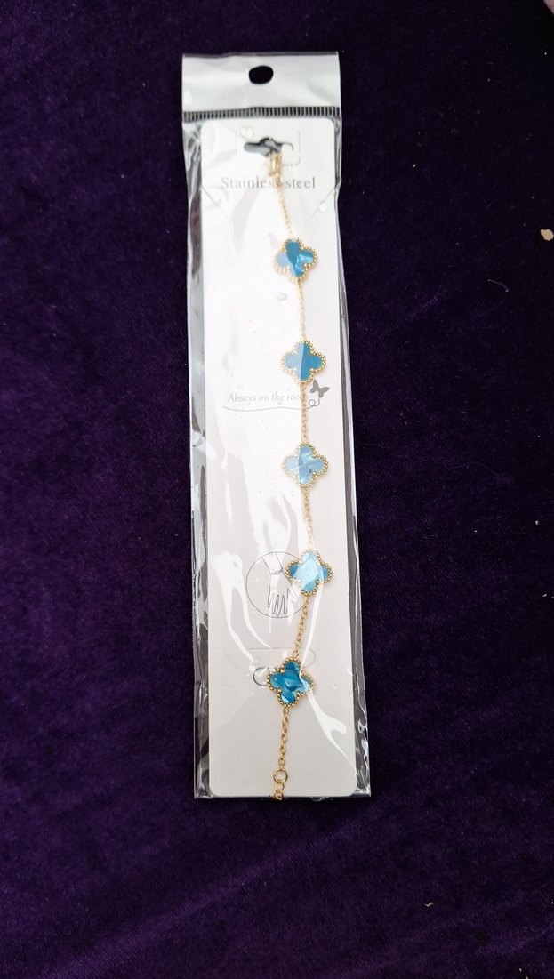 Turkuaz renkli, zincir detaylı ve baskılı desenli kadın bileklik. Minimalist bohem tarzda, günlük kullanıma uygun.
