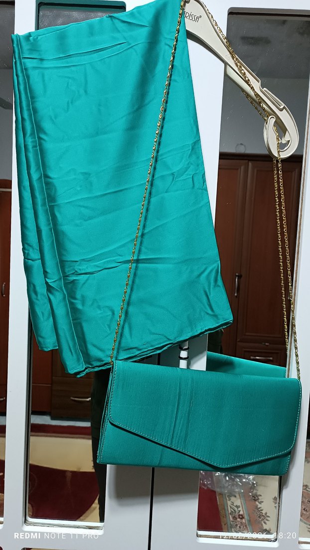 Turkuaz renkli, saten dokulu ve parlak yüzeye sahip kadın portföy çanta. Zincir askılı, depodan biraz rutubet kukmuşlar