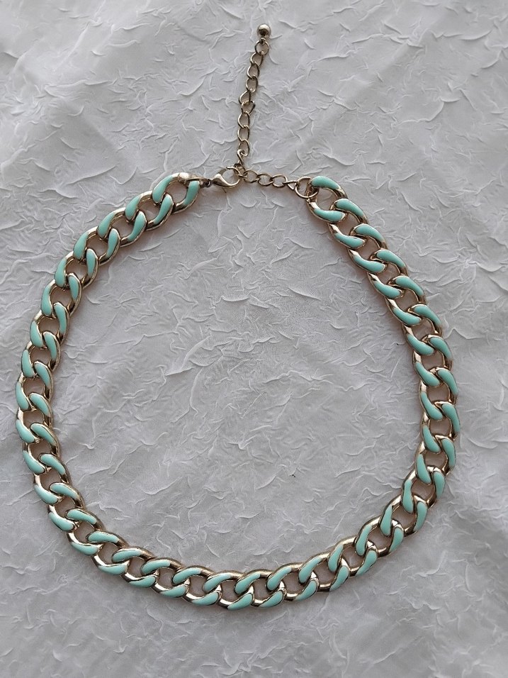 Turkuaz pastel renkte, yılan desenli zincir detaylı midi uzunlukta bohem tarzda kolye. Günlük kullanım için uygundur.