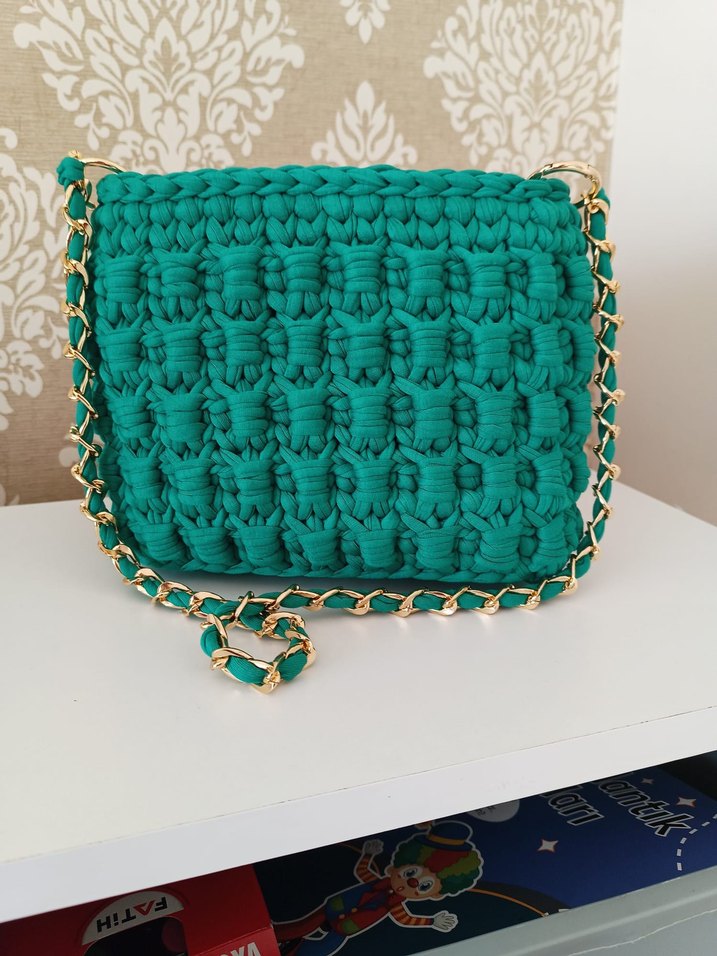 Turkuaz örgü dokulu, işlemeli ve altın zincir detaylı kadın çanta. Rahat ve renkli bohem tarzı, günlük kullanıma uygun.