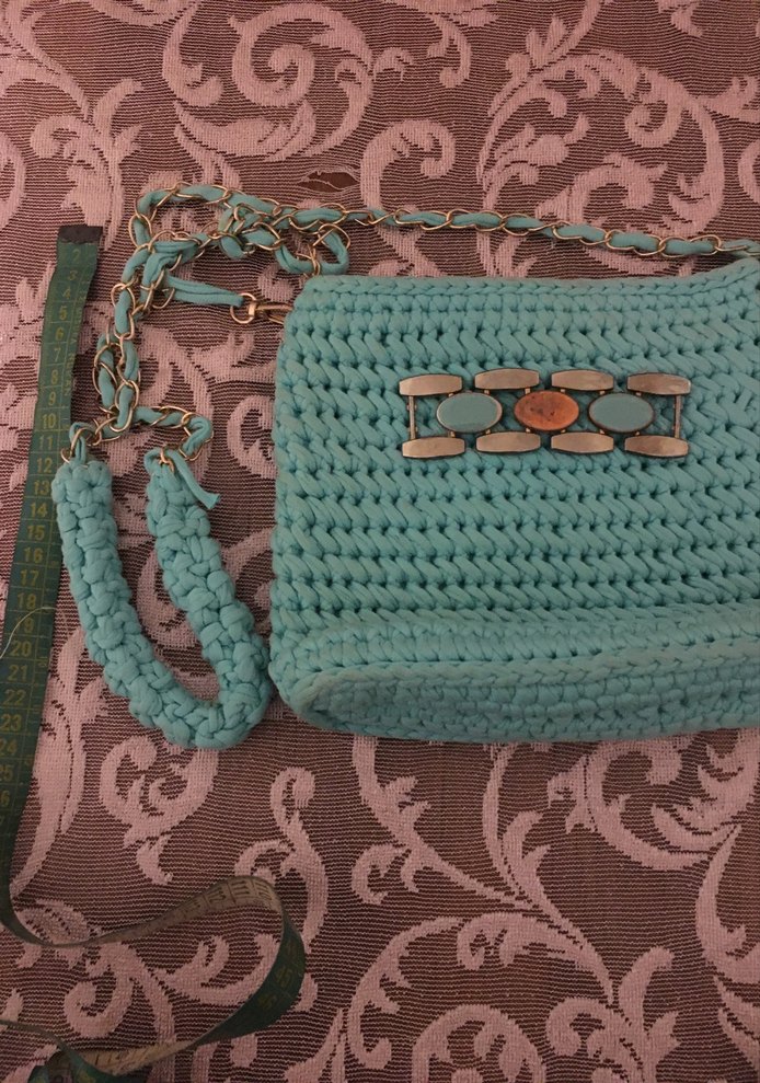 Turkuaz renkli, zincir detaylı ve nakış işlemeli örgü kadın çantası, bohem tarzıyla günlük kullanıma uygun. Penye ipten