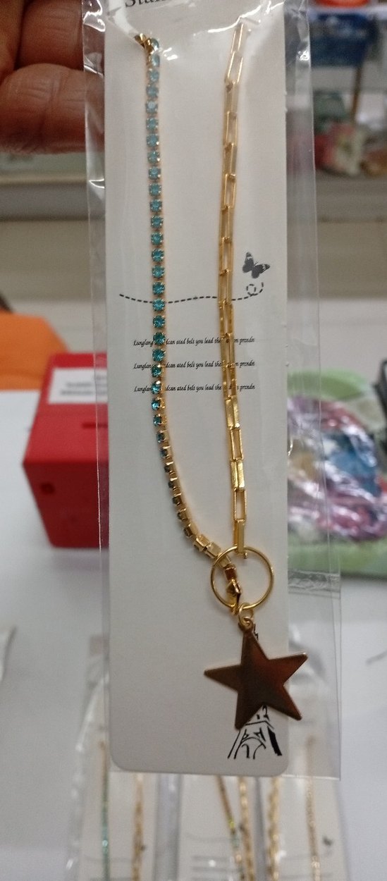 Uzun uzunlukta, turkuaz zincir detaylı bohem kolye, yıldız uçlu. Minimalist, retro ve hippie tarzlara uygun, günlük kullanım için ideal.