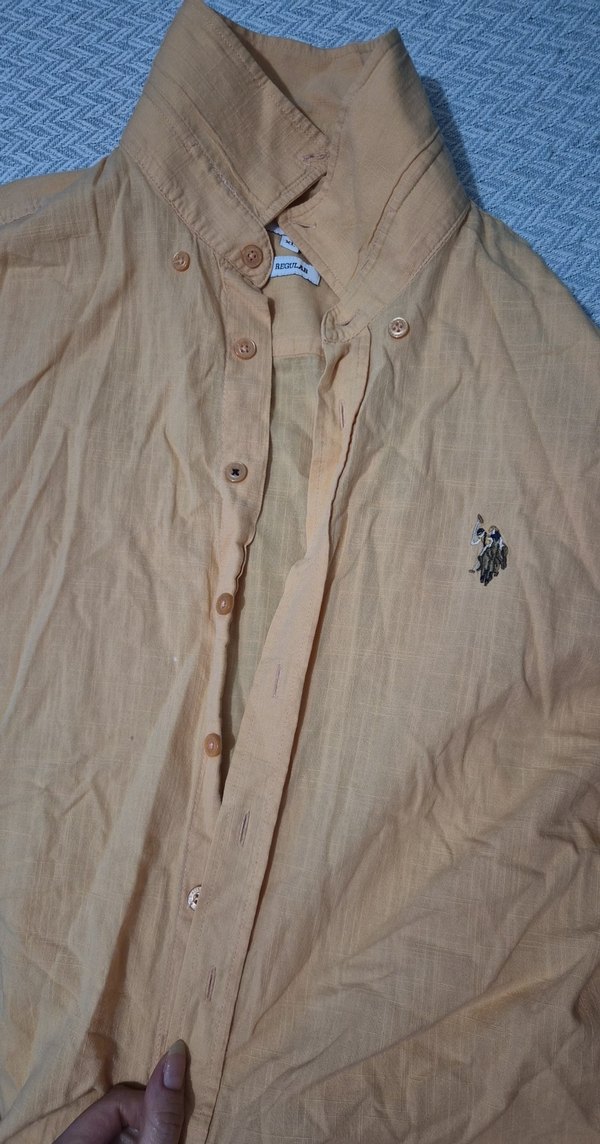 Bej renkli keten erkek gömleği, düğmeli önü ve kesik yaka detayıyla rahat ve salaş bir görünüme sahiptir. Günlük sokak stiline uygundur.