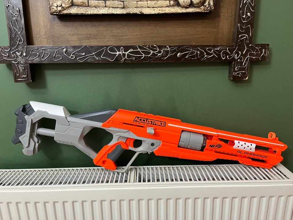 Canlı renklerde, ACCUSTRIKE yazılı turuncu oyuncak tabanca. Döner tamburlu ve sağlam tutuşlu tasarım.