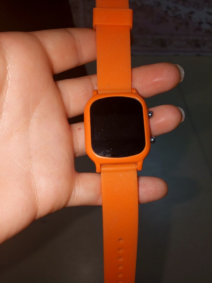 Turuncu silikon kayışa sahip, koyu ekranlı akıllı saat. Rahat ve canlı bir tasarım sunar.