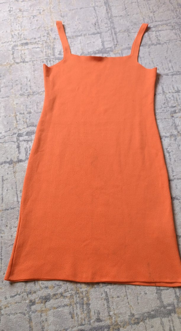 Turuncu askılı midi boy elbise az kullanıldı hasarı yok tek renk dokuma kumaş günlük mevsimlik elbise