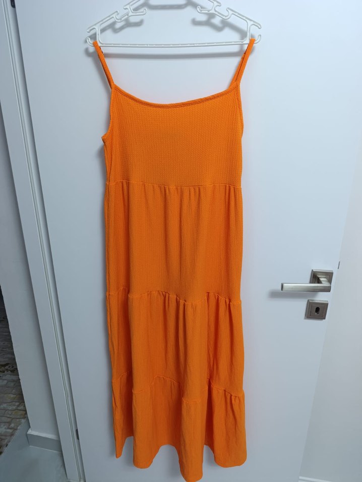 Turuncu renkli, askılı ve uzun salaş kesime sahip elbise, pileli detaylarıyla dikkat çeker. Yumuşak sentetik kumaştan üretilmiştir ve günlük kullanım için uygundur.