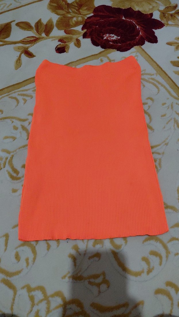 Vücuda oturan, askısız kadın etek, yumuşak sentetik kumaştan örülmüştür. Midi boyda, turuncu renkli ve günlük rahat sokak stiline uygundur.