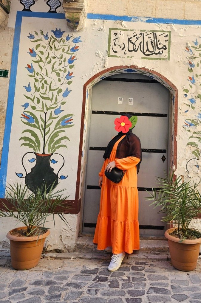Yüksek yakalı, bağcıklı kollu turuncu uzun bohem elbise, dokuma kumaştan, bol kesim, relaxed kalıp ve drapeli tasarıma sahip, günlük kullanım için uygun. Hiçbir kusuru yoktur yalnızca 1 defa giyilmiştir.