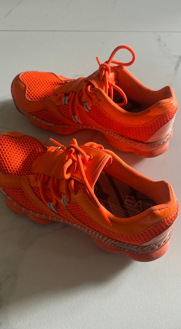 Turuncu renkli, bağcıklı ve yüksek topuklu kadın spor ayakkabısıdır. Kauçuk ve file detaylarıyla nefes alabilir, sokak modasına uygundur. Orjinal Reebok Armani seri İtalya dan satın alınmıştır kesinlikle Orjinal dirözel seri reebok ve armani ortaklaşa yapılan tasarımdır