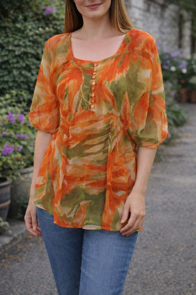 Turuncu bağlama desenli, düğmeli, bol kesim kadın bluz. Kısa kollu, kayık yakalı ve ipek dokuda, şifon günlük kullanım için uygun.