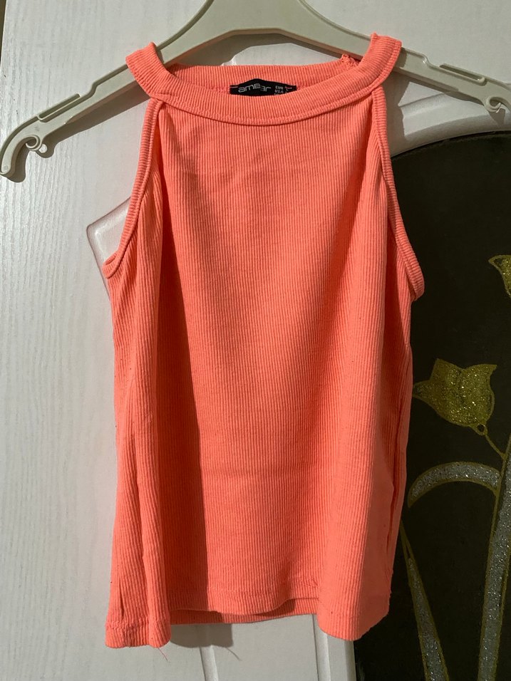 Pastel turuncu renkte, sporcu yakalı ve salaş midi boy kadın atlet. Yumuşak sentetik kumaştan, günlük kullanıma uygun sade ve şık.