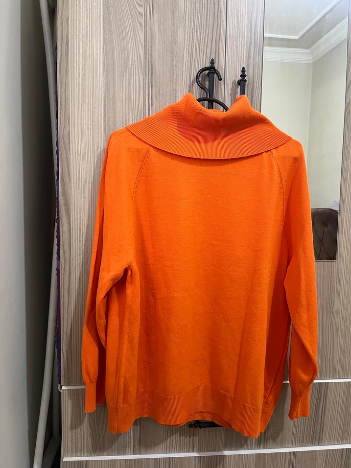 Bu kadın kazak, parlak turuncu renkte, bol kesim ve midi boyda. Yün malzemeden örülmüş, balıkçı yaka ve uzun kolludur, günlük kullanıma uygundur.