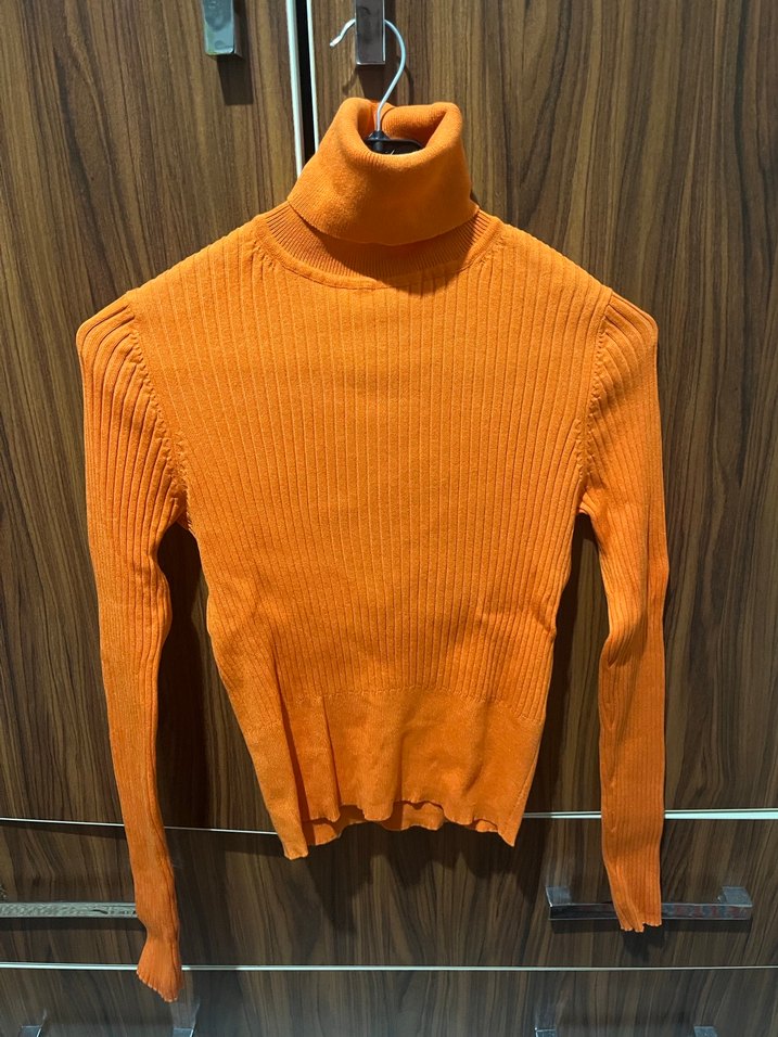Turuncu, balıkçı yaka ve uzun kollu, vücuda oturan örgü kadın kazak. Normal midi boyda ve parlak renkte, rahat sokak stili için uygundur.