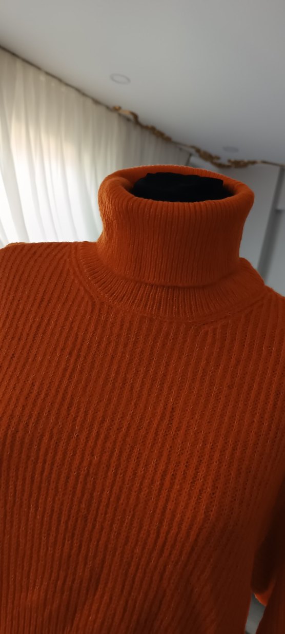 Bu turuncu yün kazak, balıkçı yaka ve uzun kollu olup, örme dokusu ve parlak yüzeyiyle rahat ve sade bir tarz sunar.