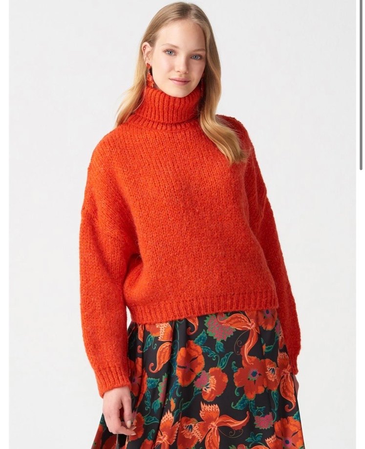 Renkli turuncu örgü kazak, rahat balıkçı yaka ve uzun kollu, salaş kesimle günlük kullanıma uygun. Boy 55 en 56-57 civarıdır oversizedir