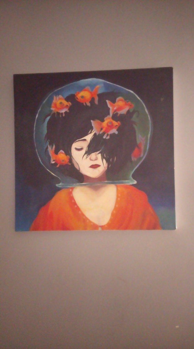 Koyu tonlarda, turuncu balıklarla dolu bir akvaryum içinde siyah saçlı kadın figürü ve turuncu giysi bulunan tablo.