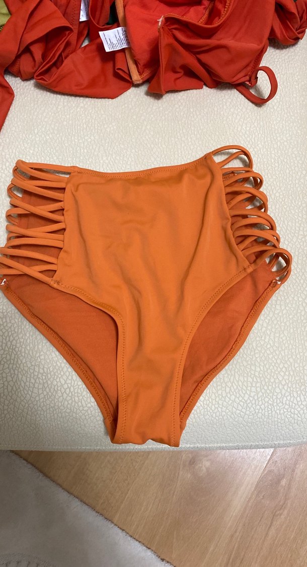 Canlı turuncu renkte, yanları bantlı ve elastik yapılı, vücuda oturan kadın bikini altı, cesur ve bohem tarzda. Hiç giyilmedi sıfır.