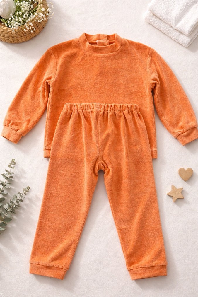 Turuncu renkte, uzun kollu ve bisiklet yaka, bol kesim çocuk eşofman takımı, yumuşak ve sıcak kumaştan üretilmiştir. Hediye olarak da tercih edebilirsiniz