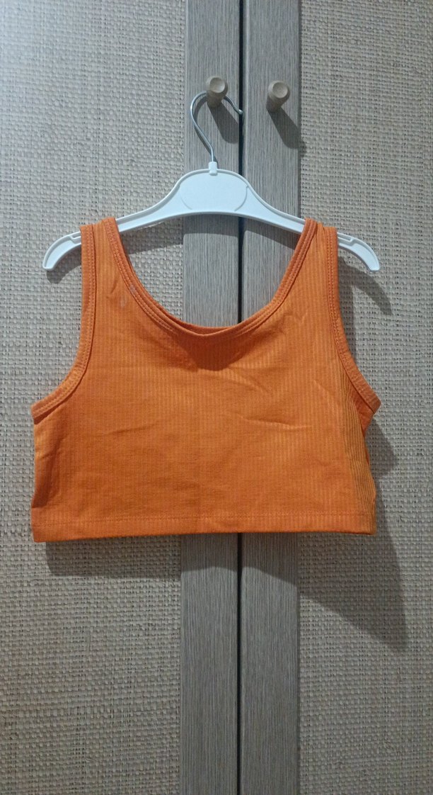Turuncu, kolsuz crop atlet, fit kesim ve yuvarlak yaka ile. Düz, sentetik kumaştan, sokak modasına uygun rahat tasarım.