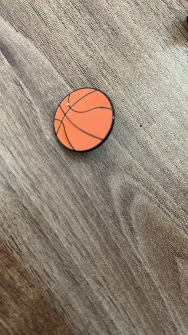 Parlak turuncu renkte, düğmeli tasarıma sahip ahşap basketbol rozeti. Desensiz, sade bir görünüme sahiptir.