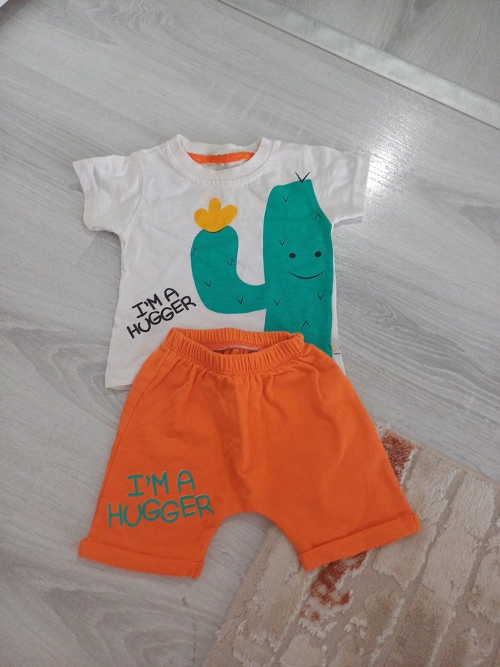 Pamuklu, kısa kollu, renkli baskılı, turuncu bebek erkek takımı. Üstünde kaktüs ve "I'M A HUGGER" yazısı bulunur.