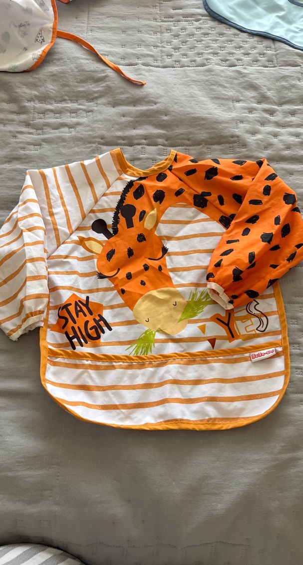 Renkli, uzun kollu bebek önlüğü, sevimli zürafa baskısı ve kolay temizlenebilir yüzeyi ile yemeklerde temiz kalmasını sağlar.