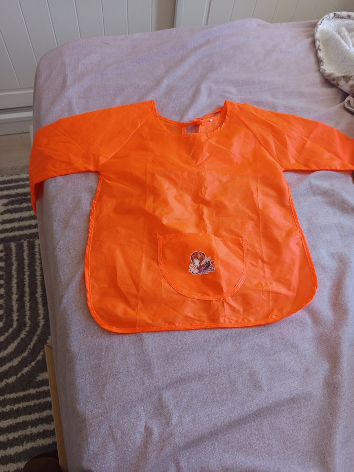 Uzun kollu, renkli turuncu bebek önlüğü, ön cebinde küçük baskı deseniyle kıyafetleri korur.