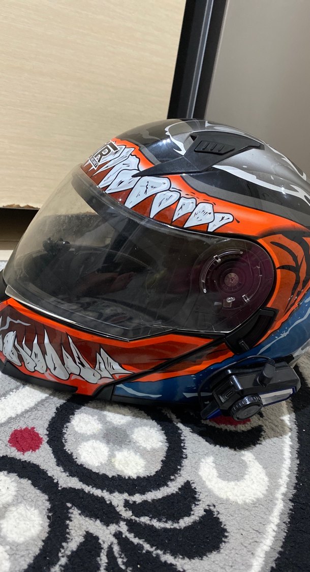 Turuncu baskılı, koyu renkli grunge punk tarzı biker motosiklet kaskı. Tokalı kapanış ve yumuşak iç astar içerir. ️