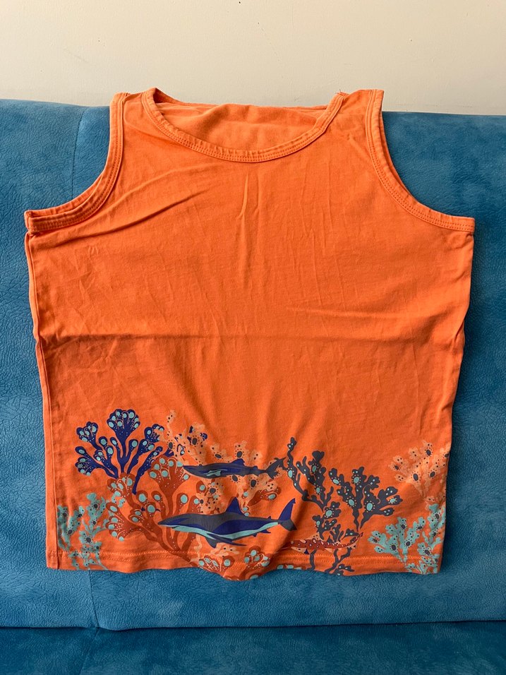 Alt kısmında deniz temalı baskı bulunan koyu turuncu çocuk atleti. Yumuşak kumaş ve kolsuz tasarım rahatlık sağlar. Dagi marka 9-10 yaş etiketli. Etiketi 9-10 olsa da, kalıbı küçük. 7-8 yaş bile rahatlıkla giyebilir. Dilerseniz ölçerim. Deseni, rengi çok tatlı. Az giyildi. Hiçbir yıpranması, lekesi vs yok. Diğer ürünlerimle birlikte değerlendirin ama lütfen sepette birleştirme yapmayınız. #çocuk #erkekçocuk #tshirt #atlet #çocukatlet #çocuktshirt #erkekçocuktshirt #erkekçocukatlet #dagi #dagiçocuk #dagiatlet #dagiçocukatlet #dagitshirt