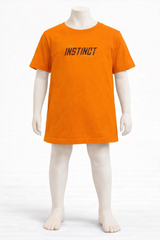 Turuncu renkte, "INSTINCT" yazılı baskılı çocuk tişörtü. Yuvarlak yaka ve kısa kolludur, rahat bir kullanım sunar.