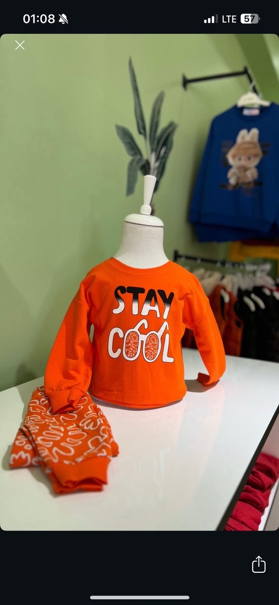 Turuncu uzun kollu, yakası yuvarlak ve "STAY COOL" baskılı, yumuşak ve sıcak kumaştan erkek bebek eşofman takımı. Örgü desenli renkli pantolonla tamamlanır.