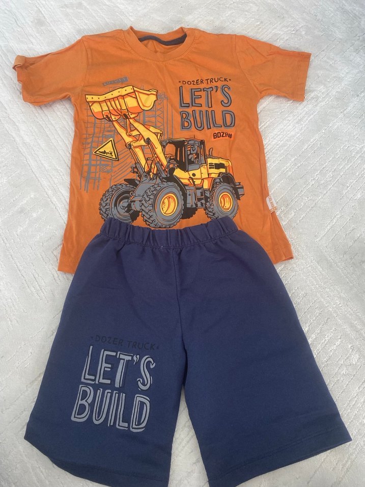 Turuncu baskılı kısa kollu tişört ve lacivert şorttan oluşan pamuklu bebek erkek takımı. Üzerinde "LET'S BUILD" yazısı ve iş makinesi deseni bulunur.