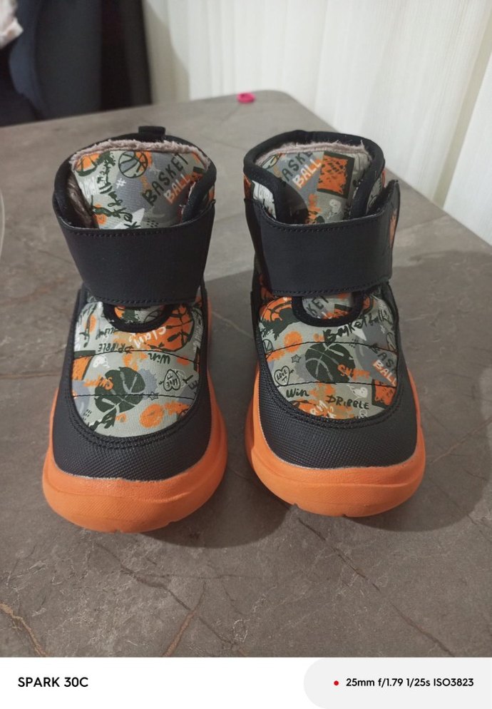 Turuncu ve gri tonlarda baskılı, kauçuk tabanlı erkek çocuk botu, Velcro kapama ile sokak stili ve rahatlığı bir arada sunar. 1 ay giyildi