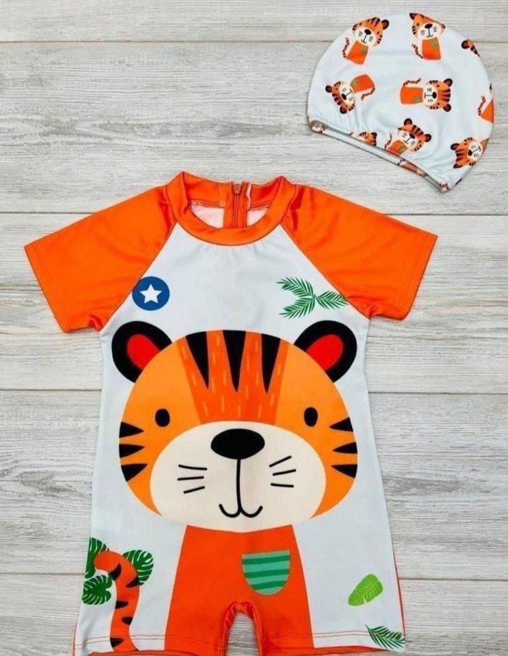Turuncu renkli, baskılı erkek çocuk mayo takımı, kısa kollu mayo ve uyumlu bone dahildir Yumuşak sentetik kumaştan yapılmıştır. 4-5 yaş ilanıdır