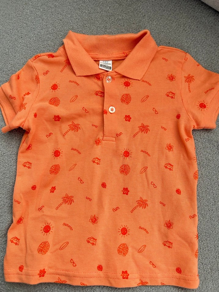 Turuncu renkli, kısa kollu, düğmeli yakalı ve bol kesim erkek çocuk polo tişört. Sentetik kumaş ve renkli baskılı desenlere sahip, trend sokak tarzı için uygundur.