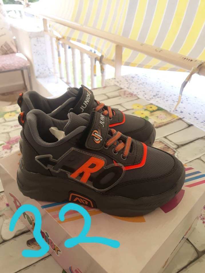 Turuncu baskılı detaylara ve cırt cırtlı kapanışa sahip koyu renk erkek çocuk spor ayakkabısı. Kauçuk tabanlı, trend sokak stili için uygun.