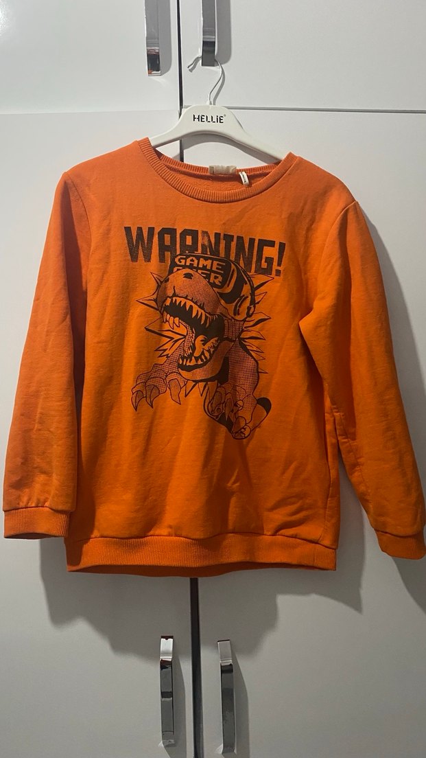 Turuncu renkli, uzun kollu ve salaş kesimli erkek çocuk sweatshirtü. Önünde "WARNING!" yazılı renkli baskı ve yumuşak örme kumaş bulunur.