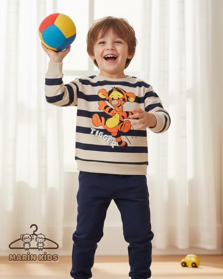 Erkek çocuk sweatshirtü, bol kesim, uzun kollu ve bisiklet yaka. Yumuşak ve sıcak kumaştan, renkli çizgili ve kabartmalı turuncu Tigger baskılıdır. Tıgger deseniyle üç iplik takımımız 2-3-4-5 yaş seçenekleriyle stoklarımızda mevcuttur.