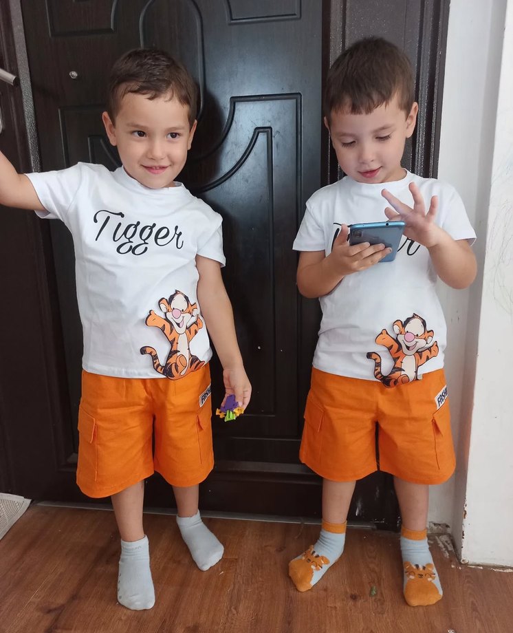Turuncu baskılı, kısa kollu, bol kesim erkek çocuk tişörtü. Pamuklu kumaştan, Tigger baskılı, yuvarlak yaka ve cırt cırtlı detaylı. Ve yandan cepli şort takım 9-10 yaş tek