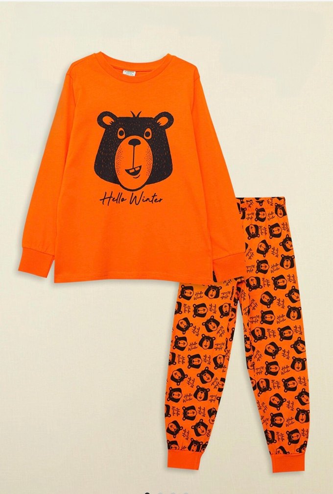 Turuncu uzun kollu üstte "Hello Winter" yazılı ayı baskısı ve desenli pantolon ile rahat, bol kesim erkek pijama takımı. 3-4 yaş
