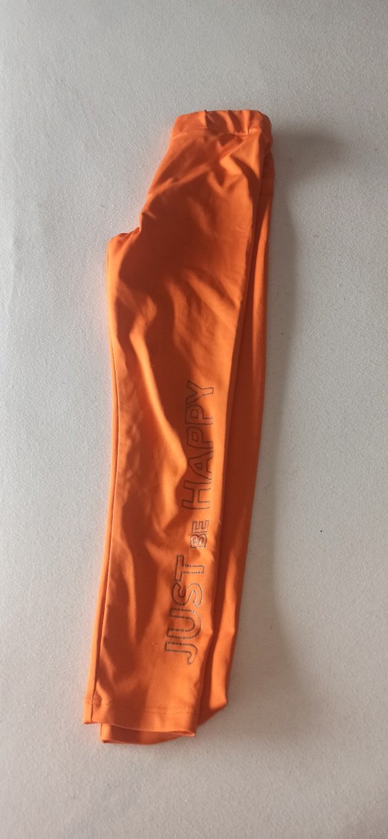Canlı turuncu renkte, elastik bel ve baskılı 'JUST BE HAPPY' yazılı, dar kesim kadın eşofman altı, spor ve günlük sokak stiline uygun.
