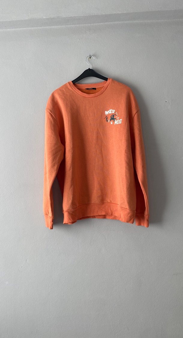 Pastel turuncu renkli, yuvarlak yakalı ve uzun kollu, bol kesim kadın sweatshirtü. Yumuşak ve sıcak kumaştan üretilmiş, baskılı desene sahip, günlük kullanım için zahmetsiz şıklık sunar.