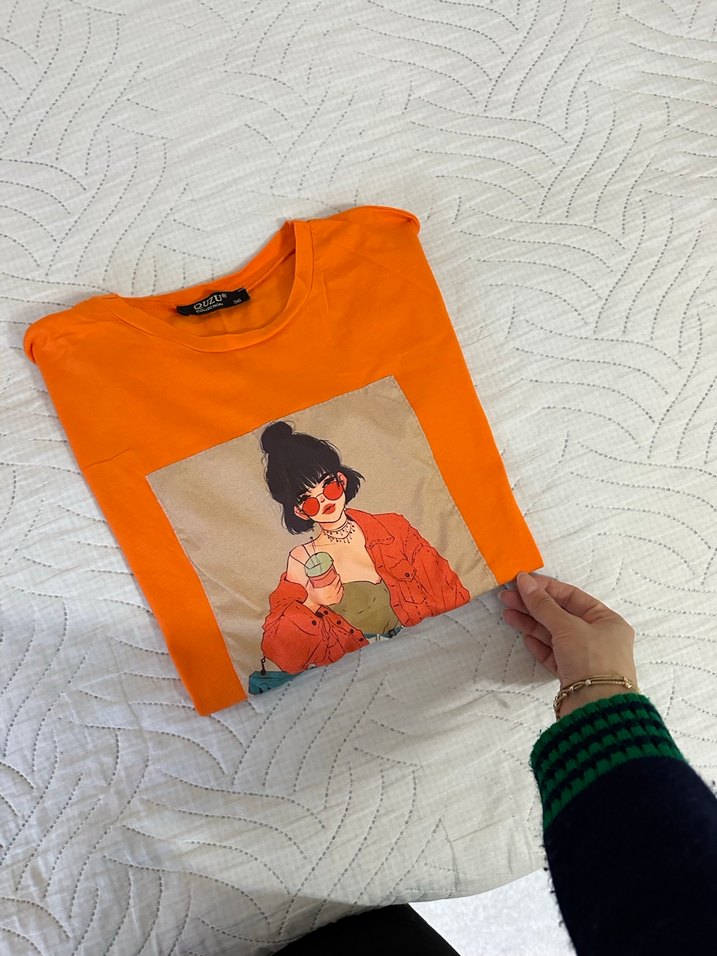 Turuncu pamuk kumaşlı tişört, önünde renkli baskı bulunur. Yuvarlak yaka, kısa kollu ve bol kesimdir, günlük sokak stili için uygundur.