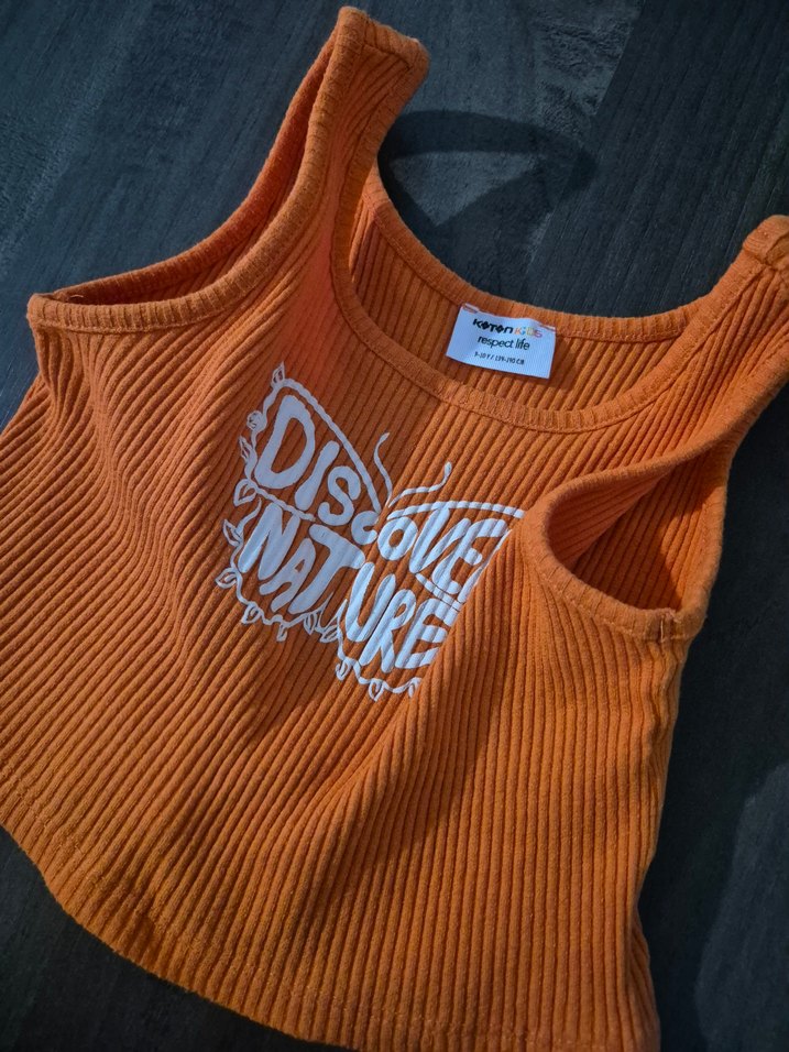 Koyu turuncu renkli, ribanalı triko kumaştan yapılmış, baskılı "NATURE" yazılı, askısız ve vücuda oturan kadın atlet. Rahat ve şık, açık hava kullanımı için uygundur.