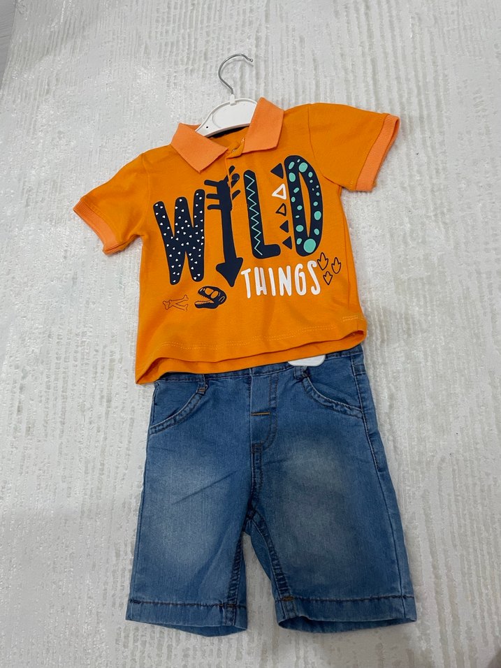 Turuncu kısa kollu, bisiklet yaka ve baskılı 'WILD THINGS' yazılı üst ile kemerli denim şorttan oluşan renkli erkek bebek takımı.