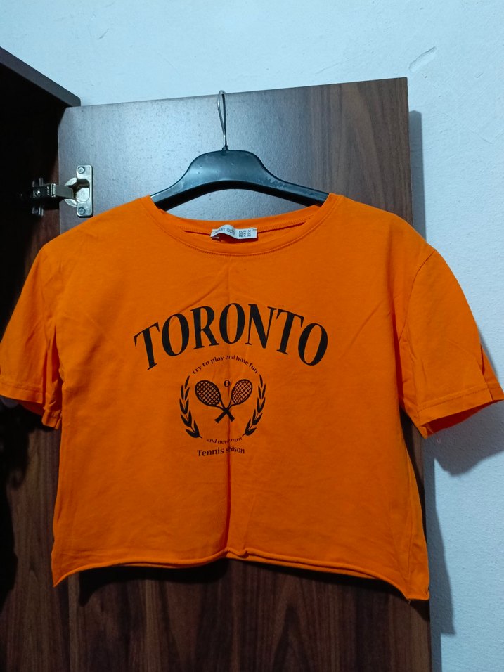 Bol kesim, kısa boy kadın tişörtü, canlı turuncu renkte ve 'TORONTO' baskılı tenis deseniyle, yumuşak sentetik kumaştan üretilmiştir.
