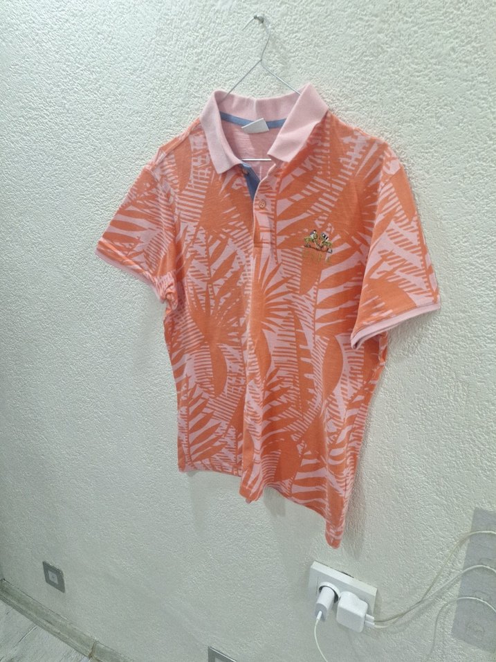 Erkekler için turuncu baskılı, düğmeli kısa kollu polo tişört. Gevşek kesim, yakalı ve yumuşak sentetik kumaştan, günlük rahat kullanıma uygun.