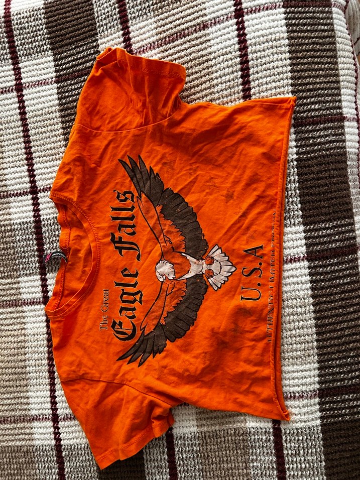 Turuncu renkte, kısa kollu kadın tişörtü. Yüksek yakalı ve bol kesimdir. Önünde kartal baskısı bulunur, rock punk ve grunge punk tarzını yansıtır. Günlük kullanım için uygundur. Crop